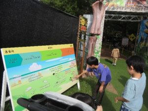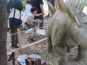 鶴見緑地は大きな公園なので「どこに恐竜がいるの?」とキョロキョロしており、最初にパークの入口を見つけた職員が「あそこにいるよ!」と声をかけると「あっ!いた!」と声をあげるものの走り出してしまう子はいませんでした。