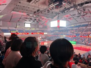 プロの試合を観戦する機会を頂き、学校のバスケットボール部に所属する男女8名の児童を連れて舞洲のおおきにアリーナへ観戦に行きました。